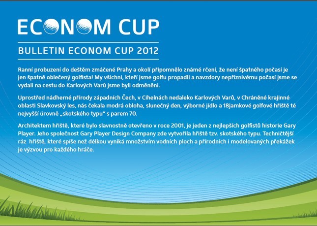 Právě vyšel Bulletin 1. ročníku golfového turnaje ECONOM CUP 2012, který proběhl 19. září 2012 na hřišti Golf Resort Cihelny